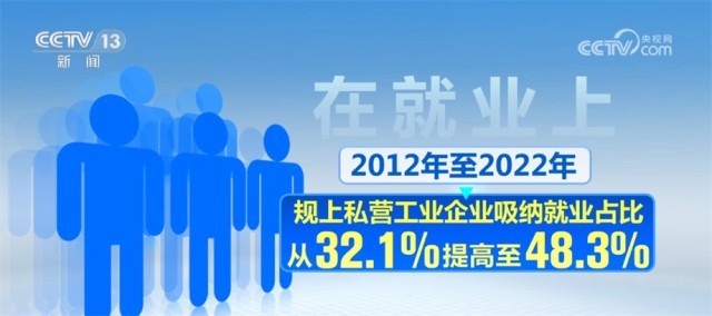 在稅收上,2012年至2021年,民企占比從48%提升至59.6%。在就業(yè)上,2012年至2022年,規(guī)上私營工業(yè)企業(yè)吸納就業(yè)占比從32.1%提高至48.3%。在數(shù)量上,2012年至2022年,民企數(shù)量占比從79.4%增長到93.3%。在外貿上,民企從2019年起成為第一大外貿主體,2022年占比達50.9%。