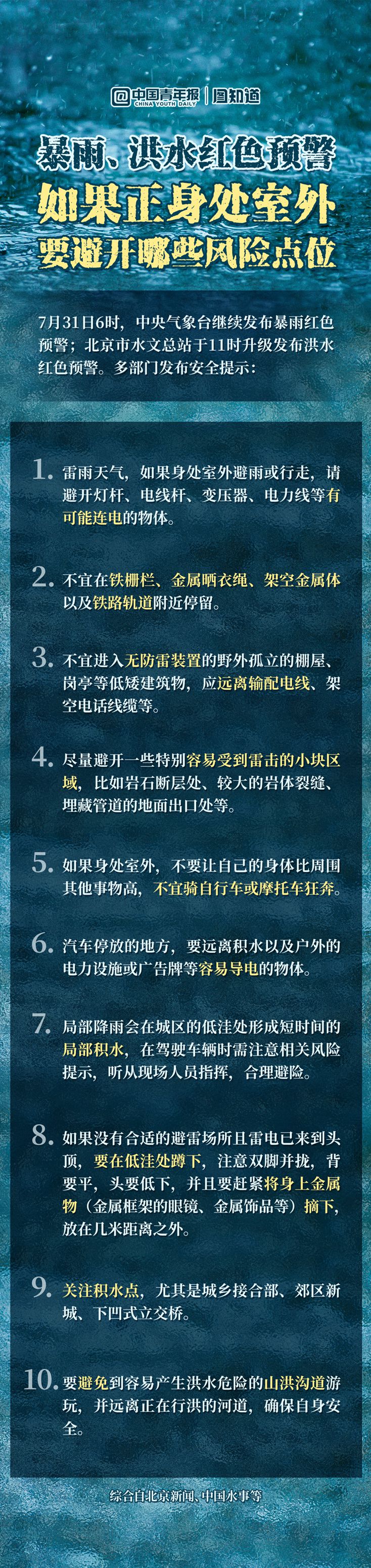 7月31日6時,中央氣象臺繼續(xù)發(fā)布暴雨紅色預(yù)警。北京市水文總站于當(dāng)日11時升級發(fā)布洪水紅色預(yù)警。如果遇到暴雨、洪水時恰好身處室外,應(yīng)避開哪些風(fēng)險點位?學(xué)習(xí)科普知識,安全度汛。