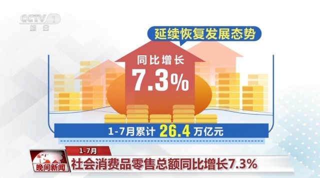 數(shù)據(jù)四:增長7.3%。商務(wù)部8月18日介紹,7月份,各地組織開展暑期消費季、國際消費季等活動,著力推動消費。在這些舉措的帶動下,7月份,社會消費品零售總額同比增長2.5%。