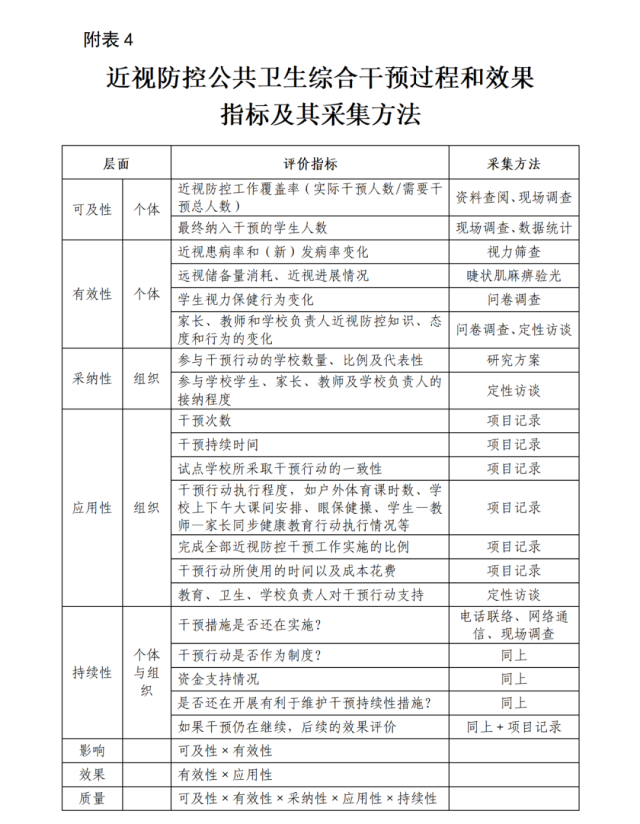 2.注重過程與效果評(píng)價(jià)。各級(jí)疾控機(jī)構(gòu)要定期開展學(xué)生視力監(jiān)測(cè)工作,深入分析歷年監(jiān)測(cè)數(shù)據(jù),將監(jiān)測(cè)發(fā)現(xiàn)的主要學(xué)生健康問題和建議及時(shí)報(bào)告當(dāng)?shù)卣?。基于?shí)施性研究方法,從理論向?qū)嵺`進(jìn)行轉(zhuǎn)化和應(yīng)用,可推進(jìn)干預(yù)行動(dòng)的實(shí)施與傳播。進(jìn)行過程與效果評(píng)價(jià),引入實(shí)施性研究框架和理論模型,如近視防控公共衛(wèi)生綜合干預(yù)過程和效果指標(biāo)及其采集方法(附表4),從個(gè)體層面和組織層面全面評(píng)價(jià)干預(yù)行動(dòng)的可及性、有效性、應(yīng)用性、可持續(xù)性,系統(tǒng)性地評(píng)估兒童青少年近視公共衛(wèi)生綜合干預(yù)的實(shí)施成效。