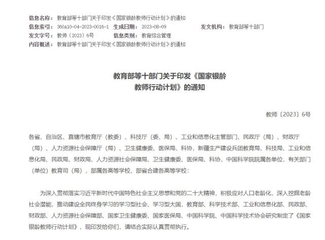 教育部等十部門:經(jīng)過3年左右,全國(guó)銀齡教師隊(duì)伍總量力爭(zhēng)達(dá)12萬(wàn)人左右