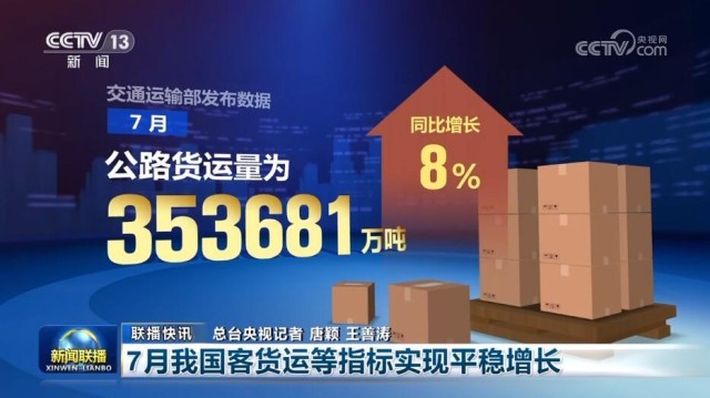 353681萬噸。交通運(yùn)輸部發(fā)布數(shù)據(jù),7月,公路貨運(yùn)量為353681萬噸,同比增長(zhǎng)8%;水路貨運(yùn)量為78964萬噸,同比增長(zhǎng)6.9%??瓦\(yùn)方面,7月公路客運(yùn)量為40798萬人,同比增長(zhǎng)19.3%;水路客運(yùn)量為3034萬人,同比增長(zhǎng)78.3%。