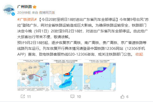 今年第9號(hào)臺(tái)風(fēng)“蘇拉”登陸廣東,將對(duì)全省鐵路運(yùn)輸造成巨大影響。為確保鐵路運(yùn)輸安全,鐵路部門(mén)決定今晚(9月1日)20時(shí)至9月2日18時(shí),對(duì)進(jìn)出廣東省列車全部停運(yùn)。由此給廣大旅客出行帶來(lái)不便,敬請(qǐng)諒解。