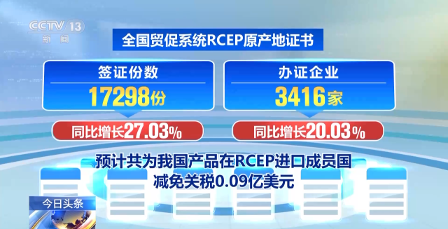 中國貿(mào)促會8月30日介紹:今年7月份,全國貿(mào)促系統(tǒng)累計簽發(fā)原產(chǎn)地證書等各類證書54.62萬份,較上年同比增長12.82%。全國貿(mào)促系統(tǒng)RCEP原產(chǎn)地證書簽證份數(shù)為17298份,同比增長27.03%;辦證企業(yè)3416家,同比增長20.03%,預計共為我國產(chǎn)品在RCEP進口成員國減免關稅0.09億美元。