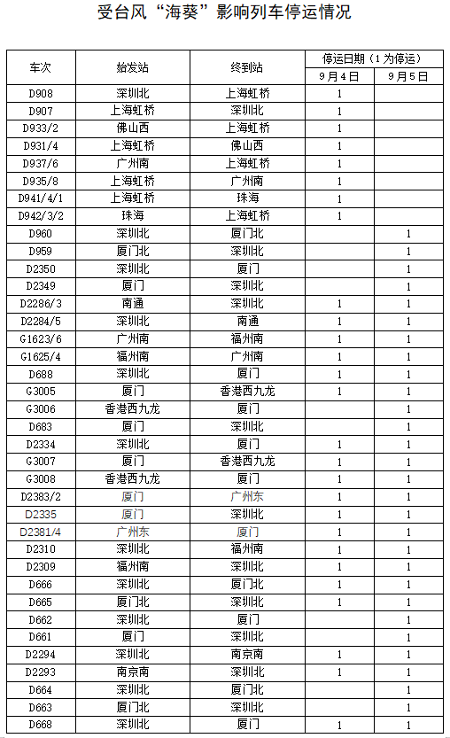 受臺(tái)風(fēng)“海葵”影響 鐵路部門停運(yùn)途經(jīng)杭深鐵路部分旅客列車