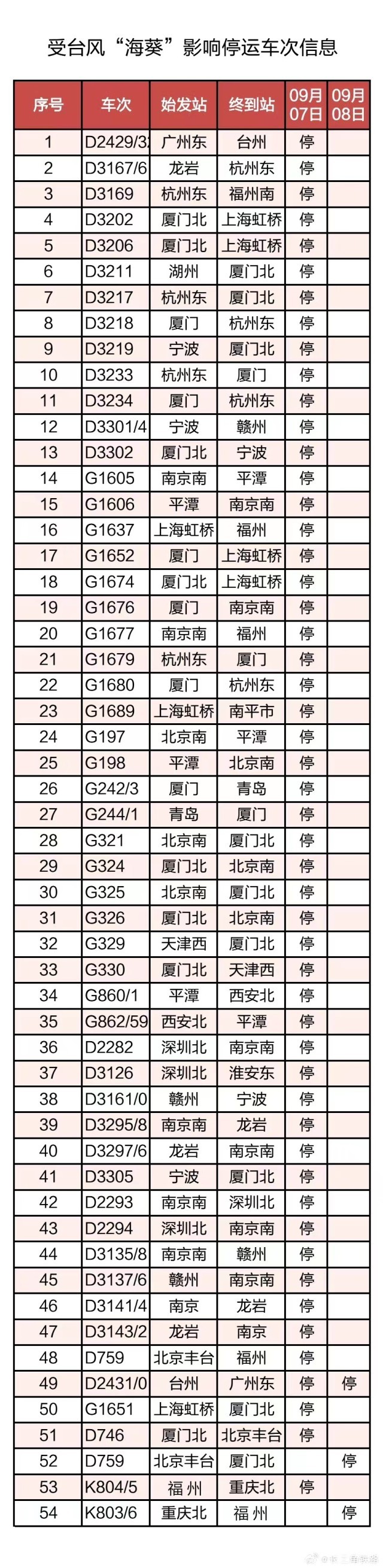 截至9月6日22時,計劃停運(yùn)9月7日至9月8日間共54趟旅客列車:其中停運(yùn)動車組列車52趟,停運(yùn)普速列車2趟。