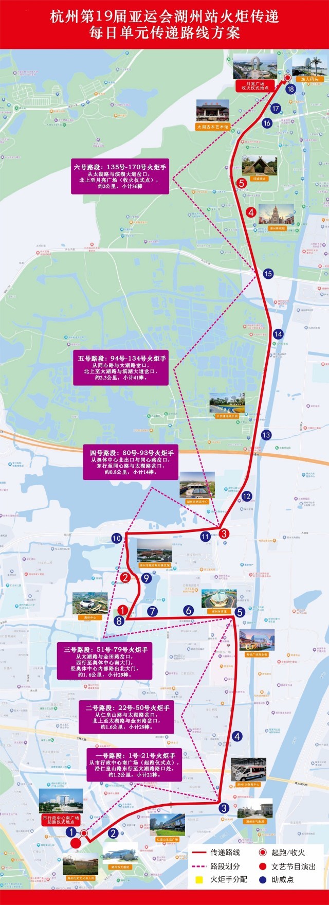 本次傳遞以“在湖州看見(jiàn)美麗中國(guó)”為主題,傳遞路線從湖州市行政中心南廣場(chǎng)出發(fā),沿仁皇山路—太湖路—金田路—奧體中心—同心路—太湖路進(jìn)行傳遞,最后到達(dá)南太湖月亮廣場(chǎng),舉行收火儀式。