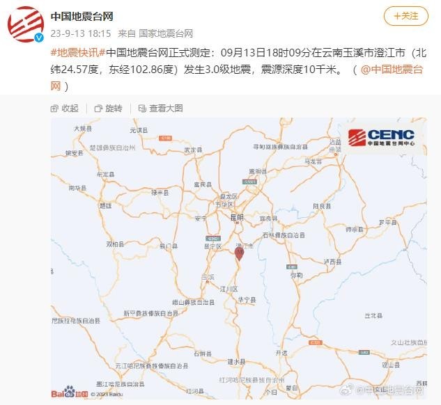 云南玉溪市澄江市發(fā)生3.0級地震,震源深度10千米