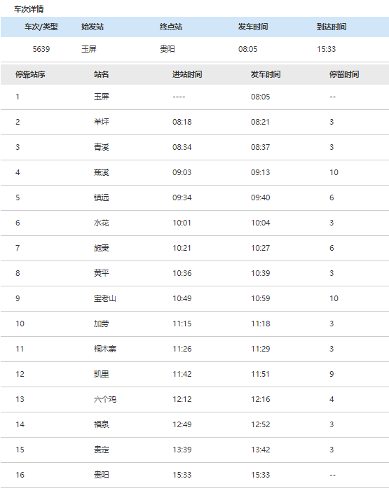 5640/5639次列車(chē)開(kāi)行于貴陽(yáng)和玉屏之間,中間途經(jīng)大大小小14個(gè)站——羊坪、青溪、蕉溪、鎮(zhèn)遠(yuǎn)、水花、施秉、黃平、寶老山、加勞、桐木寨、凱里、六個(gè)雞、福泉、貴定。