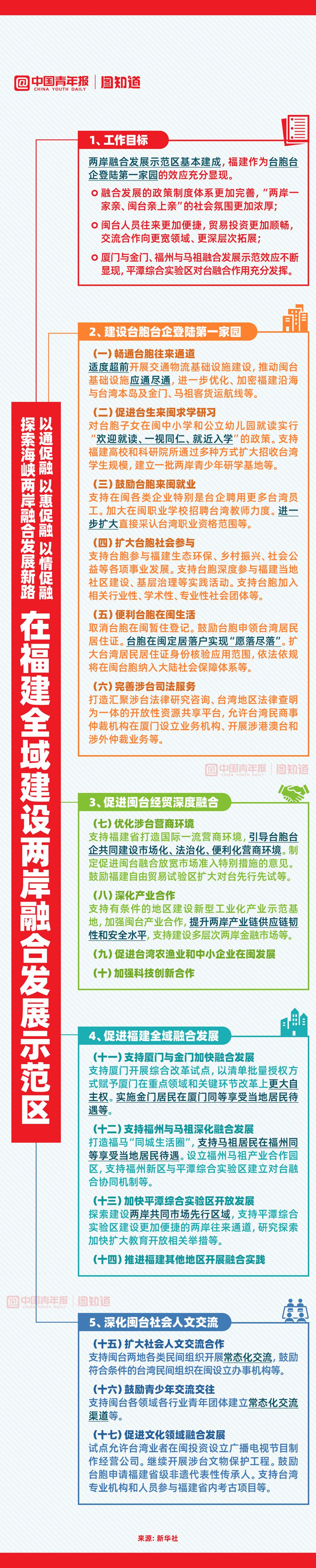 為深化兩岸各領(lǐng)域融合發(fā)展,推進祖國和平統(tǒng)一進程,中共中央、國務(wù)院近日印發(fā)《關(guān)于支持福建探索海峽兩岸融合發(fā)展新路 建設(shè)兩岸融合發(fā)展示范區(qū)的意見》,以通促融、以惠促融、以情促融,有哪些最新措施,一圖了解收藏。