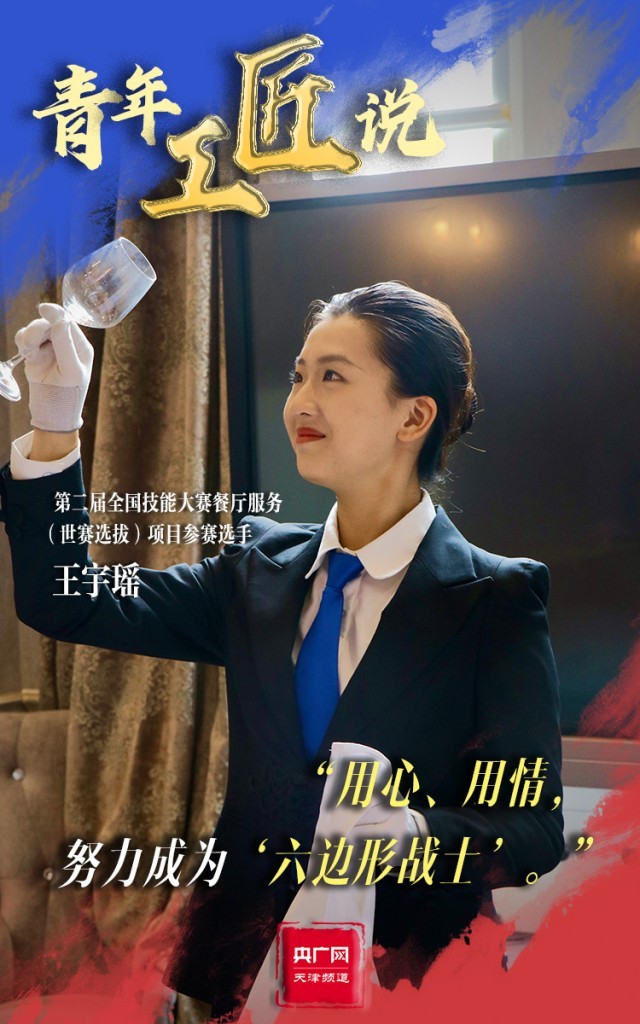 370余個考核點,對于第二屆全國技能大賽餐廳服務(世賽選拔)項目參賽選手王宇瑤來說,有著巨大的考驗。但面對困難,王宇瑤始終保持微笑,在老師的指導下練習調制雞尾酒、餐巾折花、餐桌擺盤成百上千次。整齊的著裝、得體大方的儀容、神采奕奕的狀態(tài),一顰一笑皆為王宇瑤的細心巧思?!拔覍⒁源舜伪荣悶槠鯔C,努力磨煉技藝,成為一名全面發(fā)展的‘六邊形戰(zhàn)士’?!蓖跤瞵幮χf道。