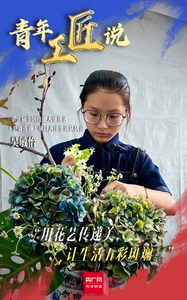 青春,是以工匠精神筑就美好生活的底色。走進位于天津農學院花藝(世賽選拔)項目的集訓現場,生機盎然、芬芳馥郁,天津集訓隊隊員吳敏怡正在挑選花材和花器,為每一件作品賦予一番獨特的意境。從2023年5月以來,吳敏怡每天要與花相伴12個小時,在審美及技術水平上的提高也讓她很有成就感。對于本次比賽,她也充滿期待:“我的目標是起碼能拿一個優(yōu)勝獎,也是為了突破自己,讓自己的花藝技術更上一層樓?!彼f,她也將用花藝傳遞生活中的美,讓生活五彩斑斕。