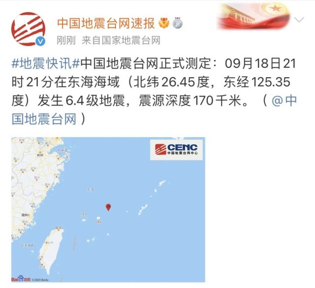 中國地震臺網正式測定:09月18日21時21分在東海海域(北緯26.45度,東經125.35度)發(fā)生6.4級地震,震源深度170千米。