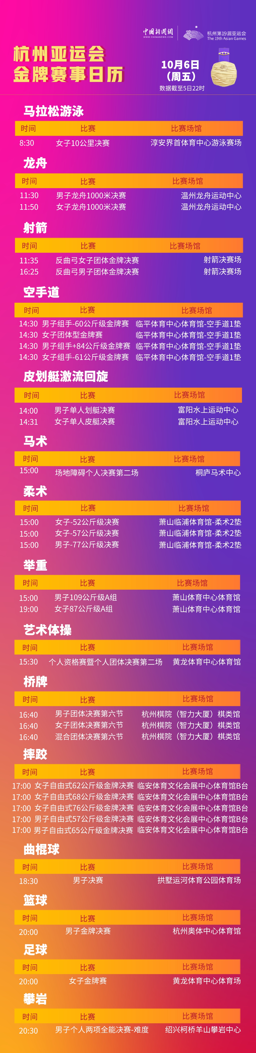 杭州亞運(yùn)會(huì)6日金牌賽程:30金懸念待解 霹靂舞開(kāi)賽
