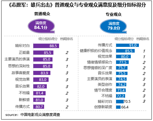 陳凱歌執(zhí)導(dǎo)的抗美援朝題材影片《志愿軍:雄兵出擊》觀眾滿意度83.8分,影片主題立意與國(guó)慶氛圍貼合,思想性得分85.0分,影片全景式呈現(xiàn)抗美援朝歷史,所傳遞的愛(ài)國(guó)精神和英雄氣概震撼人心,有85%的受訪觀眾表示在觀賞影片后感動(dòng)不已。