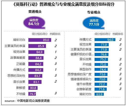 在不同觀眾評價上,《莫斯科行動》相對更受普通觀眾青睞,普通觀眾滿意度得分84.1分,居檔期第二位,與《堅如磐石》相差0.1分;專業(yè)觀眾滿意度得分77.1分,居檔期第三位。在細(xì)分指標(biāo)中,影片視覺效果和主要演員的表演均得到了不同觀眾的高度認(rèn)可,得分為各自評價指標(biāo)體系的前三名,也都居檔期五部影片的前三位。