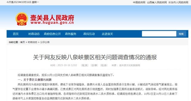 據(jù)壺關縣政府網(wǎng)站10月16日援引壺關縣文化和旅游局消息,經(jīng)調(diào)查組調(diào)查核實,現(xiàn)將10月13日網(wǎng)友反映八泉峽景區(qū)相關問題調(diào)查情況通報如下: