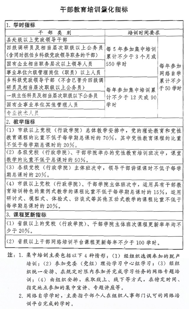 ?。ǘ熧Y隊伍建設(shè)。加大名師培養(yǎng)引進(jìn)力度,把干部教育培訓(xùn)師資納入各級人才政策支持范疇,努力造就一批對黨忠誠、精通黨的創(chuàng)新理論、授課水平高、在學(xué)科領(lǐng)域有影響力的知名教師。完善專職教師知識更新和實踐鍛煉制度,加強(qiáng)師資隊伍黨性教育和業(yè)務(wù)培訓(xùn),國家級干部教育培訓(xùn)機(jī)構(gòu)每年培訓(xùn)2000名地方和部門行業(yè)培訓(xùn)機(jī)構(gòu)的骨干教師,省級黨校(行政學(xué)院)5年內(nèi)將市、縣兩級黨校(行政學(xué)院)教師培訓(xùn)一遍。鼓勵國家級干部教育培訓(xùn)機(jī)構(gòu)和省、市兩級黨校(行政學(xué)院)教師到基層黨校(行政學(xué)校)、省(自治區(qū)、直轄市)黨性教育干部學(xué)院支教。評聘干部教育名師,推廣“名師帶徒”等方式,利用“名師工作室”等平臺,加強(qiáng)中青年骨干教師培養(yǎng)。大力推進(jìn)領(lǐng)導(dǎo)干部上講臺。注重在領(lǐng)導(dǎo)干部、先進(jìn)模范人物、優(yōu)秀基層干部中遴選培養(yǎng)師資。分級建設(shè)師資庫。探索建立符合干部教育培訓(xùn)特點的師資隊伍考核評價體系和職稱評審制度。