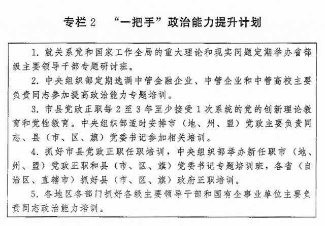?。ǘ┩怀觥瓣P(guān)鍵少數(shù)”政治訓(xùn)練。堅持把政治訓(xùn)練貫穿干部成長全周期,使干部的政治素養(yǎng)、政治能力與擔(dān)負(fù)的領(lǐng)導(dǎo)職責(zé)相匹配。強(qiáng)化“一把手”政治培訓(xùn),有計劃地選調(diào)地方、部門、國有企事業(yè)單位主要負(fù)責(zé)同志到黨校(行政學(xué)院)、干部學(xué)院參加專題培訓(xùn)。實施“一把手”政治能力提升計劃(專欄2)。?。ㄗ灾螀^(qū)、直轄市)、市(地、州、盟)、縣(市、區(qū)、旗)黨政領(lǐng)導(dǎo)班子成員每2至3年到黨校(行政學(xué)院)、干部學(xué)院至少接受1次系統(tǒng)的黨的創(chuàng)新理論教育和黨性教育,5年內(nèi)累計不少于2個月。圍繞提高政治能力和領(lǐng)導(dǎo)能力,加強(qiáng)機(jī)關(guān)司局長、處長任職培訓(xùn)。重視對女干部、少數(shù)民族干部、黨外干部等的政治培訓(xùn)。加強(qiáng)對高層次人才的政治引領(lǐng),中央組織部會同有關(guān)單位每年組織一定數(shù)量人才開展國情研修。