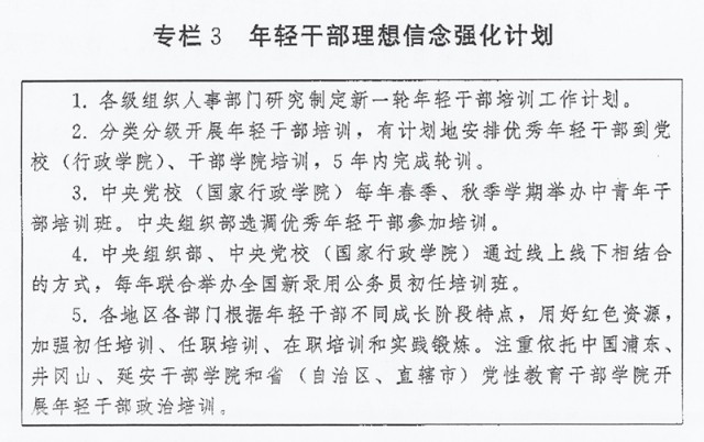?。ㄈ┘訌?qiáng)年輕干部政治訓(xùn)練。強(qiáng)化習(xí)近平新時代中國特色社會主義思想學(xué)習(xí)教育,突出政治忠誠教育、理想信念教育、紀(jì)律規(guī)矩教育,加強(qiáng)優(yōu)良傳統(tǒng)作風(fēng)和責(zé)任感使命感教育,強(qiáng)化斗爭意識,綜合運用理論講授、政策解讀、案例教學(xué)、現(xiàn)場體驗等方式開展系統(tǒng)培訓(xùn)。黨委(黨組)負(fù)責(zé)同志要講好“開班第一課”。安排思想政治素質(zhì)過硬、理論水平較高、實踐經(jīng)驗豐富的領(lǐng)導(dǎo)干部上講臺授課。探索推行“政治輔導(dǎo)員”、“導(dǎo)師幫帶”制度。通過開展黨性分析、實踐鍛煉、過“政治生日”、重溫入黨誓詞等方式,錘煉黨性修養(yǎng)、提高政治覺悟。實施年輕干部理想信念強(qiáng)化計劃(專欄3)。