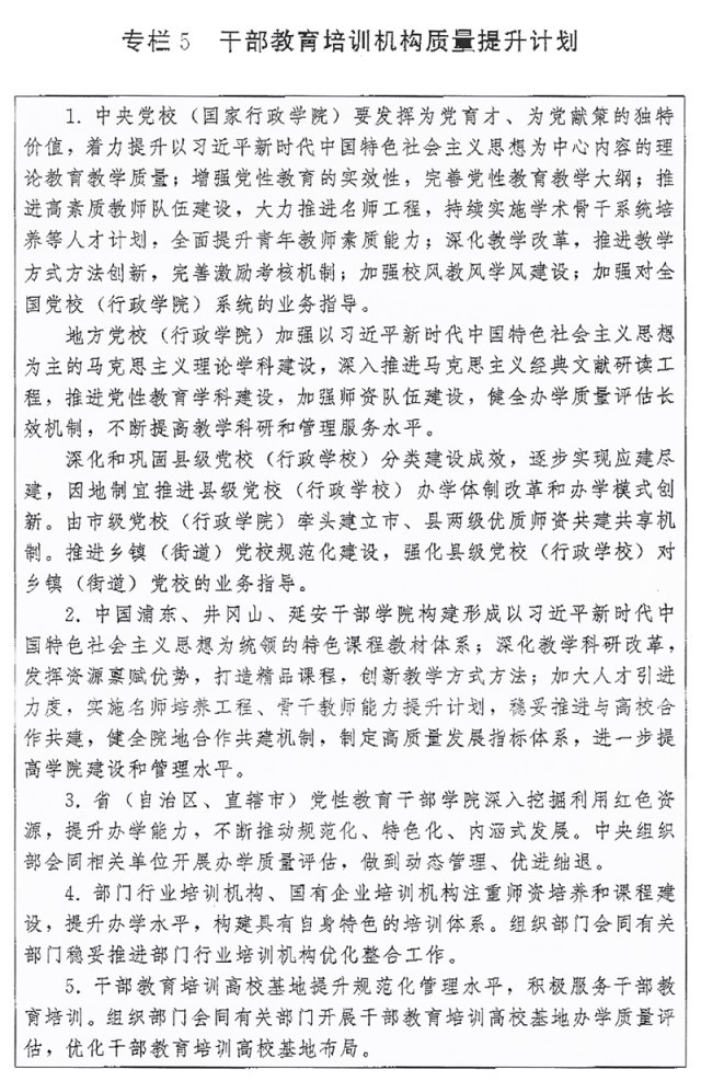 ?。ㄒ唬┡嘤?xùn)機(jī)構(gòu)建設(shè)。推進(jìn)各級黨校(行政學(xué)院)建設(shè),以教學(xué)督導(dǎo)、師資培養(yǎng)、質(zhì)量評估為重點,強(qiáng)化上級黨校(行政學(xué)院)對下級黨校(行政學(xué)院)的業(yè)務(wù)指導(dǎo),不斷提高辦學(xué)水平。推進(jìn)縣級黨校(行政學(xué)校)分類建設(shè)。加強(qiáng)社會主義學(xué)院建設(shè)。進(jìn)一步提升部門行業(yè)培訓(xùn)機(jī)構(gòu)、國有企業(yè)培訓(xùn)機(jī)構(gòu)辦學(xué)質(zhì)量。加強(qiáng)對干部教育培訓(xùn)高?;亍⒒鶎痈刹拷逃嘤?xùn)機(jī)構(gòu)辦學(xué)指導(dǎo)。開展黨校(行政學(xué)院)、?。ㄗ灾螀^(qū)、直轄市)黨性教育干部學(xué)院、干部教育培訓(xùn)高?;剞k學(xué)質(zhì)量評估。加強(qiáng)各類黨員干部教育培訓(xùn)機(jī)構(gòu)規(guī)范管理,嚴(yán)控新設(shè)以黨員干部為培訓(xùn)對象的培訓(xùn)機(jī)構(gòu)。支持地方、部門聯(lián)合開展培訓(xùn),鼓勵干部教育培訓(xùn)機(jī)構(gòu)開展區(qū)域協(xié)作交流,推動優(yōu)質(zhì)培訓(xùn)資源共享。實施干部教育培訓(xùn)機(jī)構(gòu)質(zhì)量提升計劃(專欄5)。
