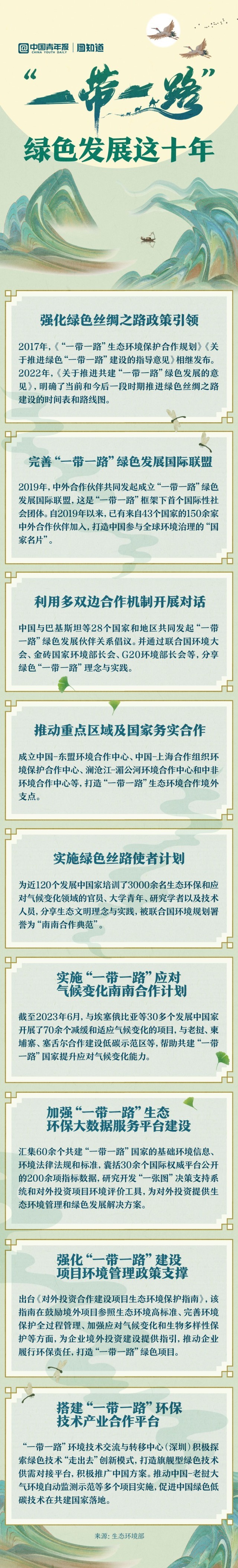 綠色已成為共建“一帶一路”鮮明底色。十年來,綠色絲綢之路建設(shè)為全球環(huán)境與氣候治理不斷貢獻(xiàn)力量。中國實(shí)施的綠色絲路使者計劃為近120個發(fā)展中國家培訓(xùn)了3000余名生態(tài)環(huán)保和應(yīng)對氣候變化領(lǐng)域的大學(xué)青年、技術(shù)人員等,許多年輕人成為綠色絲路使者,為共建“一帶一路”國家落實(shí)聯(lián)合國2030年可持續(xù)發(fā)展議程提供方案,接力下一個十年。