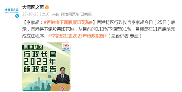 香港特區(qū)行政長官李家超今日(25日)表示,香港將下調(diào)股票印花稅,從目前的0.13%下調(diào)至0.1%,目標(biāo)是在11月底前完成立法程序。(總臺記者 羅武)