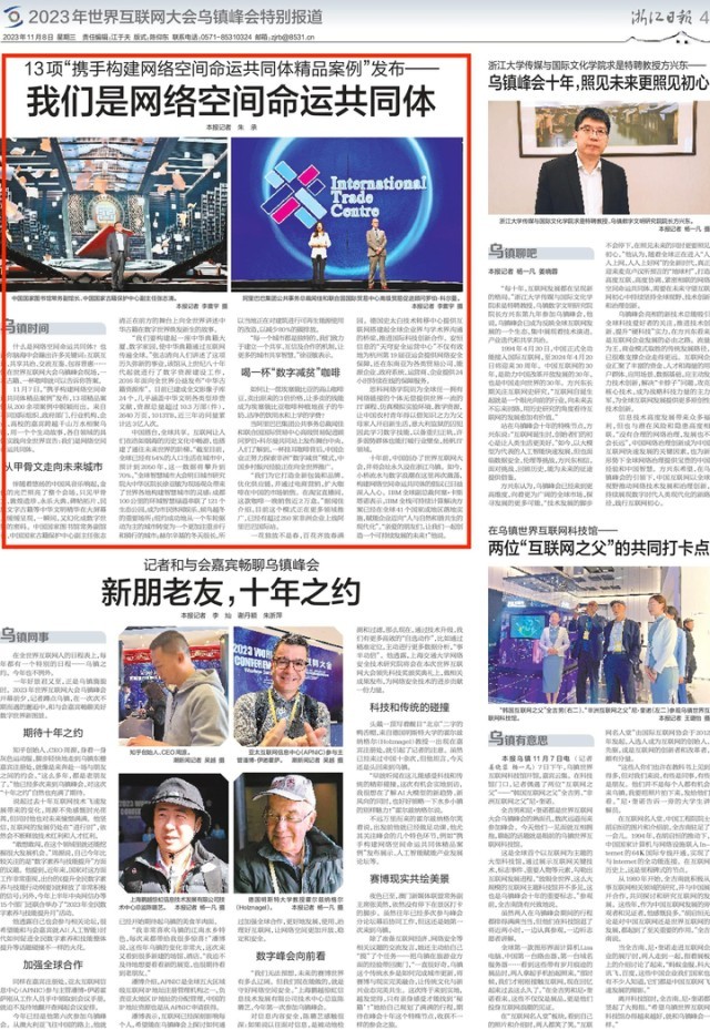 11月8日,《浙江日?qǐng)?bào)》刊發(fā)《13項(xiàng)“攜手構(gòu)建網(wǎng)絡(luò)空間命運(yùn)共同體精品案例”發(fā)布——我們是網(wǎng)絡(luò)空間命運(yùn)共同體》,全文如下: