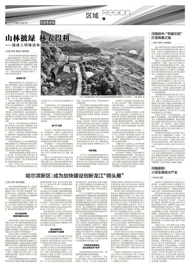“首張林票發(fā)行、首個全國林業(yè)改革發(fā)展綜合試點市、首創(chuàng)國有林場差異化績效管理激勵機制……一系列改革舉措先行先試,始終緊扣實現(xiàn)生態(tài)效益、社會效益和百姓收益共贏。”三明市林業(yè)局局長陳平說,2022年,三明市林業(yè)產(chǎn)業(yè)總產(chǎn)值達1258億元,農(nóng)民涉林收入達7107元,占可支配收入的30.6%。