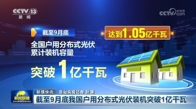 截至9月底,全國(guó)戶用分布式光伏累計(jì)裝機(jī)容量突破1億千瓦,達(dá)到1.05億千瓦。今年前9個(gè)月,全國(guó)戶用分布式光伏新增裝機(jī)3297.7萬(wàn)千瓦,是去年全年的1.3倍。