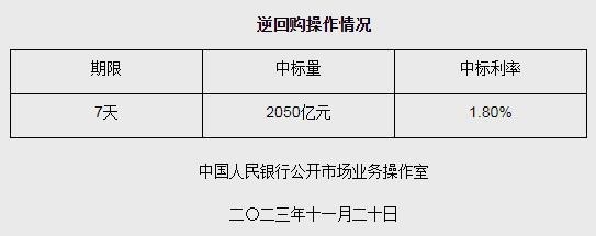 中新網(wǎng)11月20日電 據(jù)央行網(wǎng)站消息,為維護(hù)銀行體系流動(dòng)性合理充裕,2023年11月20日人民銀行以利率招標(biāo)方式開展了2050億元逆回購操作,中標(biāo)利率1.80%,期限為7天。具體情況如下: