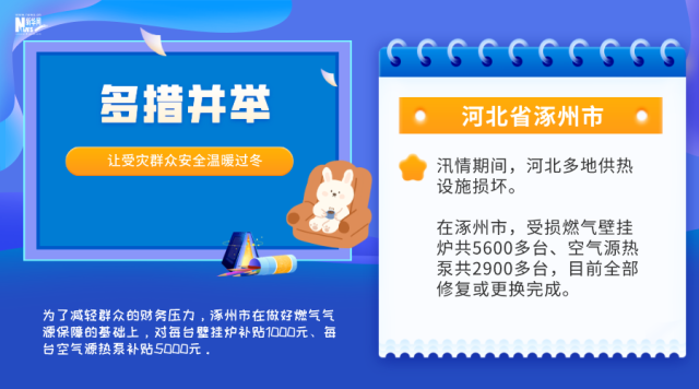 汛情期間,河北多地供熱設(shè)施損壞。在涿州市,受損燃?xì)獗趻鞝t共5600多臺(tái)、空氣源熱泵共2900多臺(tái),目前全部修復(fù)或更換完成。為了減輕群眾的財(cái)務(wù)壓力,涿州市在做好燃?xì)鈿庠幢U系幕A(chǔ)上,對(duì)每臺(tái)壁掛爐補(bǔ)貼1000元、每臺(tái)空氣源熱泵補(bǔ)貼5000元。在河北保定淶水縣,10個(gè)位于山區(qū)、丘陵的鄉(xiāng)鎮(zhèn)今冬要使用潔凈煤取暖,預(yù)計(jì)使用量在5.1萬(wàn)噸左右。淶水縣督促相關(guān)企業(yè),早謀劃、早對(duì)接、早儲(chǔ)備,組織車輛加快配送,確保供得上、供得及時(shí)。