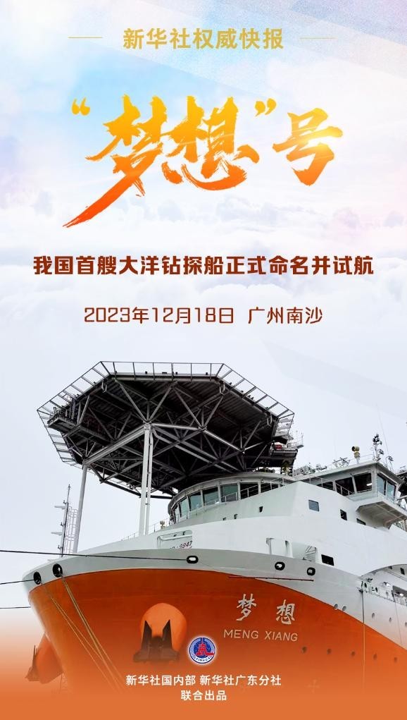 12月18日,我國(guó)自主設(shè)計(jì)建造的首艘大洋鉆探船正式命名為“夢(mèng)想”號(hào),并在廣州南沙首次試航。