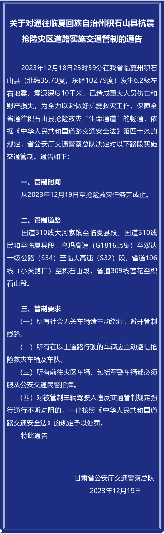 2023年12月18日23時59分在甘肅省臨夏州積石山縣發(fā)生6.2級左右地震,已造成重大人員傷亡和財(cái)產(chǎn)損失。為全力以赴做好抗震救災(zāi)工作,保障甘肅全省通往積石山縣搶險救災(zāi)“生命通道”的暢通,甘肅省公安廳交通警察總隊(duì)對抗震搶險災(zāi)區(qū)道路實(shí)施交通管制,至搶險救災(zāi)任務(wù)完成止,詳情如下: