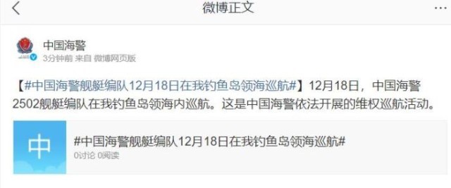 中新網(wǎng)12月18日電 據(jù)中國海警官方微博消息,12月18日,中國海警2502艦艇編隊(duì)在我釣魚島領(lǐng)海內(nèi)巡航。這是中國海警依法開展的維權(quán)巡航活動。