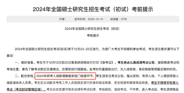 記者注意到,近日,多地發(fā)布2024考研須知。其中,黑龍江省、遼寧省、河南省等地明確,今年研考入場(chǎng)新增智能安檢門檢查環(huán)節(jié)。