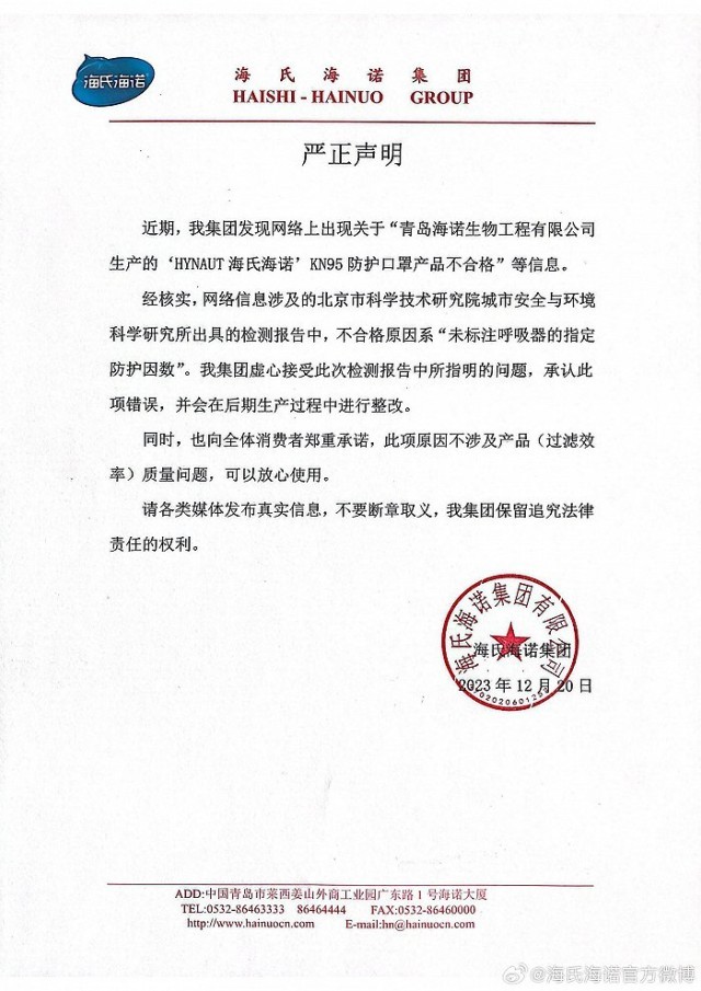 央視網(wǎng)消息:據(jù)海氏海諾官方微博發(fā)布聲明稱(chēng),近期,集團(tuán)發(fā)現(xiàn)網(wǎng)絡(luò)上出現(xiàn)關(guān)于“青島海諾生物工程有限公司生產(chǎn)的‘HYNAUT 海氏海諾’KN95防護(hù)口罩產(chǎn)品不合格”等信息。經(jīng)核實(shí),網(wǎng)絡(luò)信息涉及的北京市科學(xué)技術(shù)研究院城市安全與環(huán)境科學(xué)研究所出具的檢測(cè)報(bào)告中,不合格原因系“未標(biāo)注呼吸器的指定防護(hù)因數(shù)”。海氏海諾表示,虛心接受此次檢測(cè)報(bào)告中所指明的問(wèn)題,承認(rèn)此項(xiàng)錯(cuò)誤,并會(huì)在后期生產(chǎn)過(guò)程中進(jìn)行整改。同時(shí),海氏海諾承諾,此項(xiàng)原因不涉及產(chǎn)品(過(guò)濾效率)質(zhì)量問(wèn)題,可以放心使用。