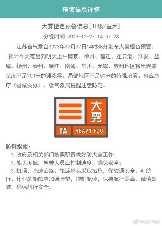 央視網(wǎng)消息:據(jù)@江蘇氣象 微博消息,江蘇省氣象臺2023年12月27日14時38分發(fā)布大霧橙色預(yù)警: 預(yù)計今天夜里到明天上午南京、徐州、宿遷、連云港、淮安、鹽城、揚州、泰州、鎮(zhèn)江、南通、常州、無錫、蘇州地區(qū)將出現(xiàn)能見度不足200米的強濃霧、局部地區(qū)不足50米的特強濃霧。江蘇省應(yīng)急廳(省減災(zāi)辦)、省氣象局提醒注意防范。