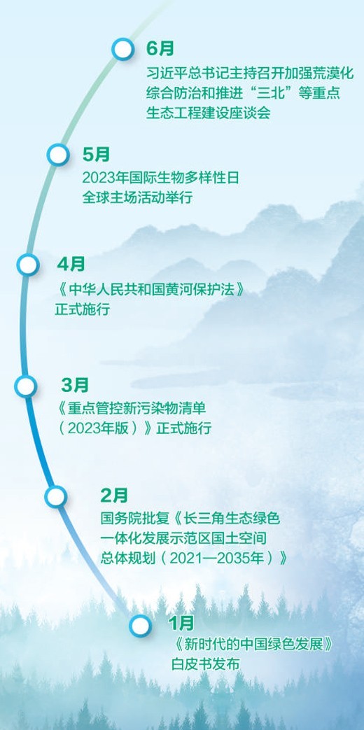 總結(jié)新時代10年的實踐經(jīng)驗,我們對生態(tài)文明建設(shè)的規(guī)律性認識不斷深化。2023年是我國生態(tài)文明建設(shè)道路上具有里程碑意義的一年。這一年,我國天更藍、地更綠、水更清,美麗中國建設(shè)交出滿意答卷,人民群眾獲得感、幸福感、安全感顯著增強。這一年,全國生態(tài)環(huán)境保護大會召開,我國迎來首個全國生態(tài)日,黃河保護法正式施行,“三北”工程三大標志性戰(zhàn)役開局順利,綠色低碳發(fā)展腳步不斷加快。