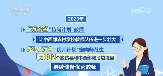 強(qiáng)教必先強(qiáng)師。2023年,5萬余名“特崗計(jì)劃”教師讓中西部農(nóng)村學(xué)校教師隊(duì)伍進(jìn)一步壯大,超過1萬名“優(yōu)師計(jì)劃”定向師范生為832個(gè)脫貧縣和中西部陸地邊境縣繼續(xù)儲備優(yōu)秀教師。