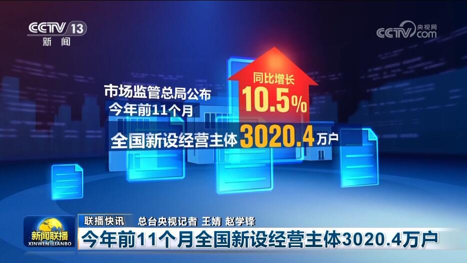 今年前11個(gè)月全國(guó)新設(shè)經(jīng)營(yíng)主體3020.4萬(wàn)戶