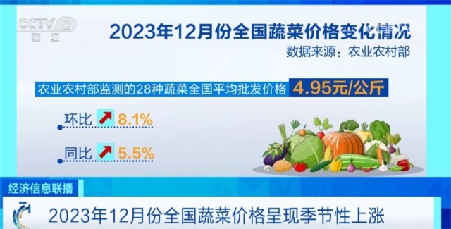 央視網(wǎng)消息:來(lái)關(guān)注“菜籃子”價(jià)格。農(nóng)業(yè)農(nóng)村部最新數(shù)據(jù)顯示,2023年12月份全國(guó)菜籃子指數(shù)為123.32,環(huán)比上漲6.89個(gè)點(diǎn),蔬菜價(jià)格呈現(xiàn)季節(jié)性上漲。