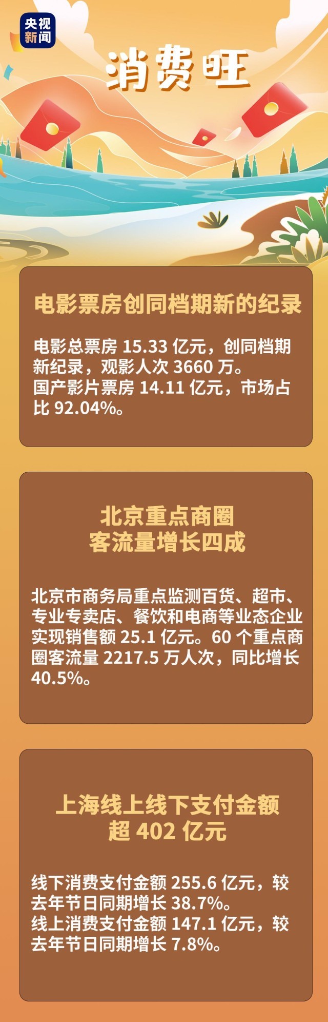 元旦假期中,大街小巷“煙火氣”升騰,持續(xù)涌動的消費熱情也不斷刷新各項數(shù)據(jù)??靵硪黄鸨P點元旦假期有哪些亮眼成績↓↓↓