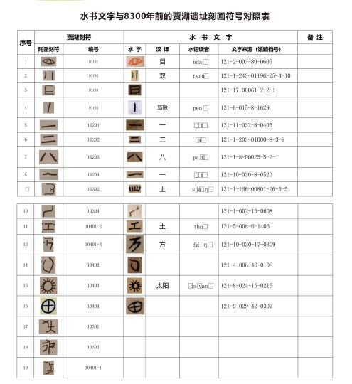 中國貴州省黔南布依族苗族自治州水書申報(bào)《世界記憶遺產(chǎn)名錄》領(lǐng)導(dǎo)小組辦公室、黔南州檔案館最新研究發(fā)現(xiàn),中國水書文字與中國河南省偃師市二里頭夏都遺址出土的24個(gè)刻畫符號(hào)相同,與中國浙江省良渚文化遺址出土的700多個(gè)刻畫符號(hào)中的104個(gè)符號(hào)相同,與中國安徽省蚌埠市雙墩遺址出土的600多個(gè)刻畫符號(hào)中的73個(gè)符號(hào)相同,與中國河南省賈湖遺址出土的19個(gè)刻畫符號(hào)中的16個(gè)符號(hào)相同。