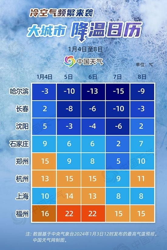 近期,我國大部氣溫整體偏高,在度過了較常年偏暖的“一九”之后,又迎來以溫暖開場的“二九”。不過,這種偏暖的天氣格局即將發(fā)生逆轉(zhuǎn)!1月5日至7日,新一股冷空氣將自南向北影響我國中東部,東北、華北等地氣溫起伏較大。收好這份降溫日歷,看哪些城市將迎明顯降溫。