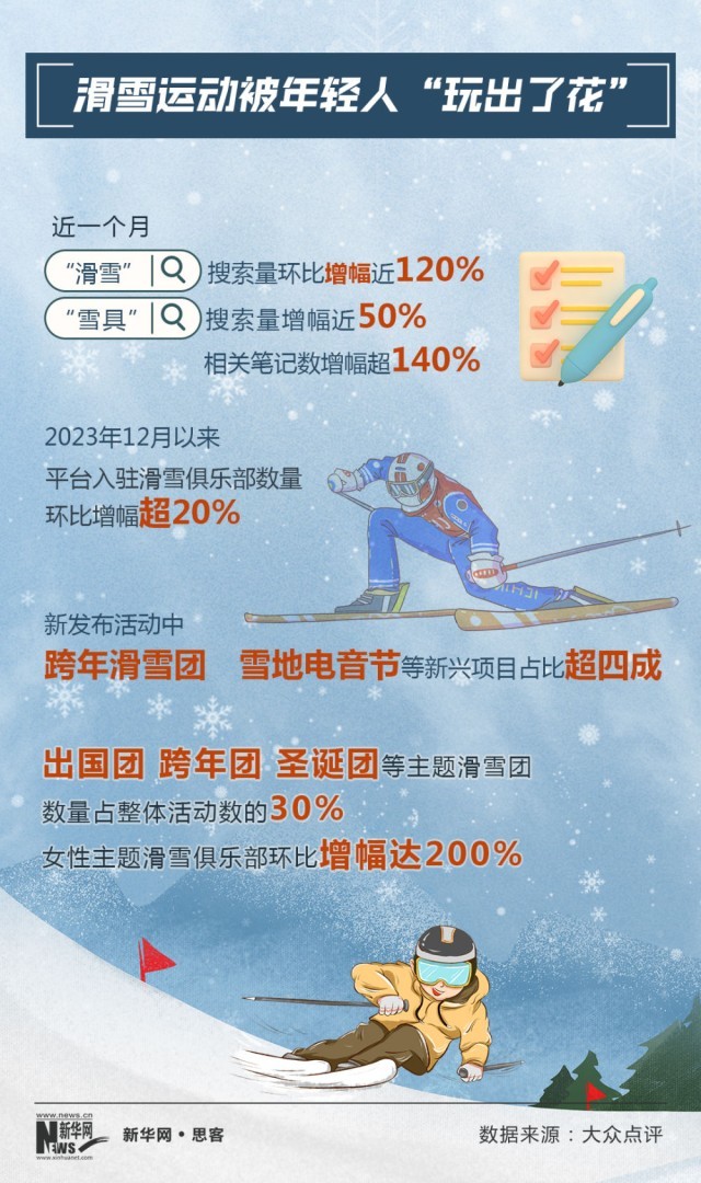 大眾點評數(shù)據(jù)顯示,2023年12月以來,滑雪俱樂部入駐數(shù)量環(huán)比增幅超20%。新發(fā)布活動中,雪地電音節(jié)、滑雪旅行團等新興項目占比超四成?!盎彼阉髁凯h(huán)比增幅近120%,“雪具”搜索量增幅近50%,相關(guān)筆記數(shù)增幅超140%。很多“95后”網(wǎng)友表示,自己一直都想滑雪,在網(wǎng)絡(luò)上看到一些“滑雪+電音節(jié)”的筆記攻略,被這種新穎的形式吸引,立刻“種草”。