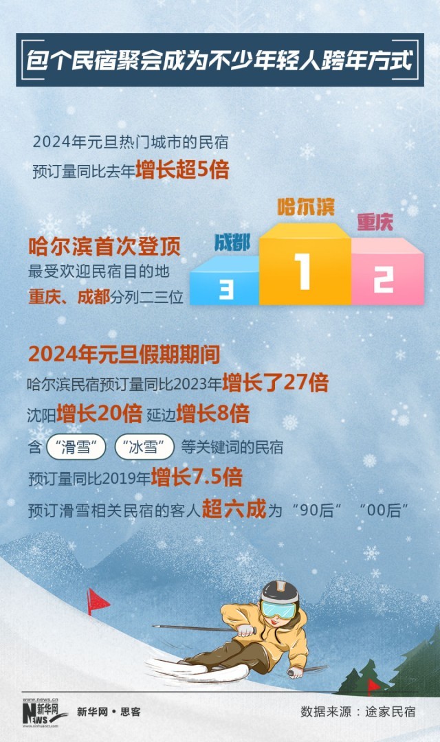 2024年元旦,民宿成為冰雪旅游一大熱詞。2024年元旦熱門城市的民宿,預(yù)訂量同比2023年增長超5倍。北方民宿更是強勢崛起,哈爾濱首次登頂最受歡迎民宿目的地。