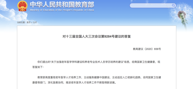 早在2021年,教育部官網(wǎng)曾公布《對十三屆全國人大三次會議第9284號建議的答復(fù)》,下一步,教育部將進一步加強面向全體醫(yī)學(xué)類專業(yè)學(xué)生開展老年醫(yī)學(xué)教育,同時,協(xié)同國家衛(wèi)生健康委,鼓勵高校加強老年醫(yī)學(xué)學(xué)科建設(shè)、推進老年醫(yī)學(xué)??漆t(yī)師規(guī)范化培訓(xùn)。