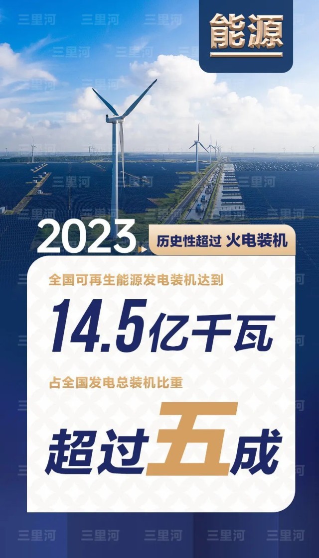 2023年,全國(guó)可再生能源發(fā)電裝機(jī)達(dá)到14.5億千瓦,占全國(guó)發(fā)電總裝機(jī)比重超過(guò)五成,歷史性超過(guò)火電裝機(jī)。