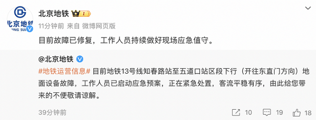 央視網(wǎng)消息:據(jù)@北京地鐵 微博最新消息,地鐵13號(hào)線知春路站至五道口站區(qū)段下行(開(kāi)往東直門(mén)方向)地面設(shè)備故障已修復(fù),工作人員持續(xù)做好現(xiàn)場(chǎng)應(yīng)急值守。